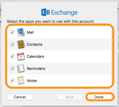 Finally, select what information you would like to sync with your Apple machine. If you want to sync all your Mail, Contacts, Calendar, Reminders and notes select all and click done.